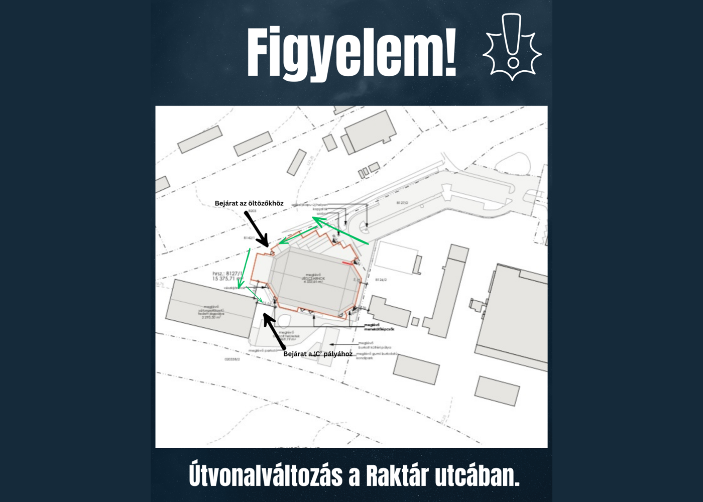 Tájékoztatást adunk arról, hogy 2026. február 16-án 17:00 órától a C-pályához vezető, eddig gyalogosan használt autóút teljes mértékben lezárásra kerül mind a gyalogos-, mind a gépjárműforgalom elől.